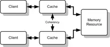 Cuando los clientes de un sistema, en particular las CPUs en un multiprocesador, mantienen cachés de una memoria compartida, los conflictos crecen. Haciendo referencia al dibujo, si el cliente de arriba tiene una copia de un bloque de memoria de una lectura previa y el cliente de abajo cambia ese bloque, el cliente de arriba podría estar trabajando con datos erróneos, sin tener conocimiento de ello. La coherencia de la caché intenta administrar estos conflictos y mantener consistencia entre las cachés y la memoria.
