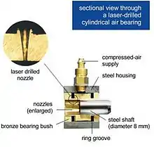Los cojinetes de aire (también conocidos como cojinetes aerostáticos o cojinetes aerodinámicos) son un tipo de cojinetes de fluidos que utilizan una película delgada de gas presurizado como soporte de baja fricción entre dos superficies en movimiento. Las dos superficies no se tocan, lo que evita los problemas tradicionales relacionados con los cojinetes de fricción (como el desgaste, la formación de partículas o la necesidad de lubricación), y ofrecen claras ventajas si se requiere un ajuste de precisión (como la ausencia de holgura y de fricción estática), y en aplicaciones de alta velocidad.[1]