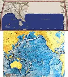 Arriba: Una reconstrucción del Sinus Magnus de acuerdo a la consideración de Marino de Tiro (225° de longitud para la Ecumene, 75° aprox. para el Gran Golfo). Abajo, la verdadera extensión del océano pacífico: 160° (15.000 km), casi la mitad de aquella medida. Imagen: Pablo Cayuela