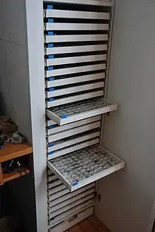 - Colecciones sistemáticas. En este caso se intenta obtener el máximo número de especies minerales de entre las existentes, aunque su tamaño o calidad sea muy desigual. Algunas especies, especialmente las más comunes, pueden estar representadas por ejemplares de buena calidad y tamaño, mientras que otras lo serán por ejemplares con los cristales visibles solamente con lupa binocular, por masas informes o incluso por granos diminutos guardados en cápsulas especiales. En este caso hay que tener en cuenta que el rápido crecimiento del número de especies y el tamaño cada vez menor con el que generalmente aparecen hace difícil ampliarla a partir de un cierto límite.[2] Además, la fragmentación excesiva con fines comerciales de minerales raros, hasta hacerlos prácticamente invisibles perjudica a la ciencia de la mineralogía, ya que ya no resultan útiles para futuros estudios.[3]