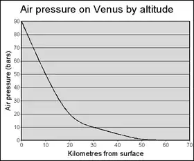 La atmósfera de Venus está hecha principalmente de dióxido de carbono. Debido a que el nitrógeno y el oxígeno son más ligeros que el dióxido de carbono, los globos llenos de aire respirable flotarán a una altura de unos 50 km (31 millas). A esta altura, la temperatura es manejable, de 75 °C (348 K; 167 °F). A 5 km (3,1 millas) más alto, es un templado 27 °C (300 K; 81 °F)