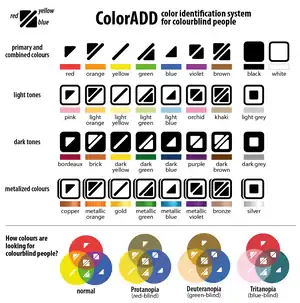 El código ColorADD, o simplemente ColorADD, es un sistema gráfico de identificación de los colores concebido para las personas que padecen de daltonismo. El código está basado en cinco símbolos gráficos, los correspondientes a los tres colores primarios, más el blanco y el negro,[1] cuya combinación representa una amplia gama de diferentes colores y tonalidades. Este sistema fue realizado por el diseñador portugués y Emprendedor Social de Ashoka Miguel Neiva, profesor e investigador de la Universidad del Miño, y presentado internacionalmente en el congreso TEDxO'Porto de la ciudad de Oporto en el año 2010.[2][3]