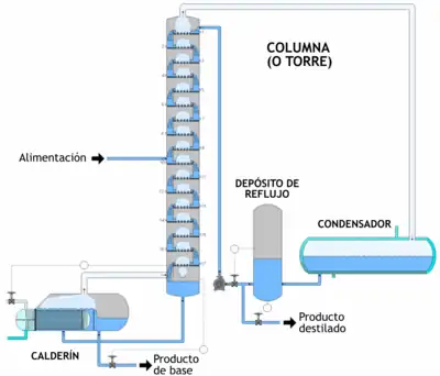 La destilación es uno de los procesos de separación más comunes e intensivos en energía. La efectividad de la separación depende de la altura y el diámetro de la columna, la relación entre la altura de la columna y el diámetro, y el material que comprende la propia columna de destilación.[6] En una planta química típica, representa aproximadamente el 40% del consumo total de energía.[7] La destilación industrial se realiza típicamente en grandes columnas cilíndricas verticales (como se muestra en la Figura 2) conocidas como "torres de destilación" o "columnas de destilación" con diámetros que oscilan entre aproximadamente 65 centímetros y 6 metros y alturas que van desde aproximadamente 6 metros hasta 60 metros o Más.