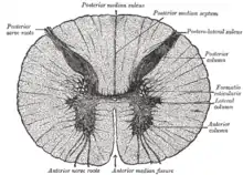 ![]() Sección transversal de la médula espinal. Las tres columnas grises forman la región sombreada en forma de mariposa. | ||