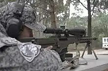 Operador de la AFEAU destacamento Charlie de la Fuerza Aérea con un fúsil MRAD