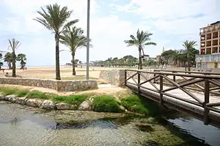 ![]() Playa de Comarruga, con el puerto al fondo | ||