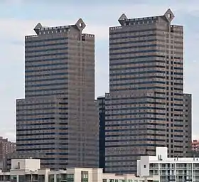 Ubicada en West Market Street en Center City, Filadelfia, Pensilvania, Commerce Square comprende torres de oficinas gemelas de 41 pisos y 172 m diseñadas por Henry N. Cobb y Douglas Gardner de IM Pei & Partners. Commerce Square cubre una manzana entera, entre las calles 20 y 21 y Market Street y John F. Kennedy Boulevard.[10][18][19] Commerce Square contiene 200.000 m², que incluye 170.000 m² de espacio para oficinas, 8.500 m² vestíbulo y un 16.000 m², garaje de estacionamiento para 625 autos. Los rascacielos revestidos de granito gris pálido presentan Retranqueoreveses en los lados norte y sur del edificio, con los pisos inferiores que contienen 3.100 m² y los pisos superiores 1.400 m².[10] Los pisos cuentan con una gran cantidad de espacio, un diseño influenciado por las necesidades de IBM en la década de 1980.[20] Las dos torres están rematadas con un par de diamantes de piedra con cuadrados recortados en el centro.[21]