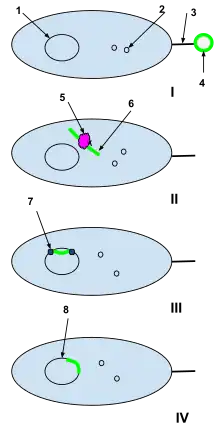II: El plásmido extraño se transduce a través de los pili sexuales hacia la célula bacteriana, donde es procesado por enzimas de restricción de células bacterianas. Las enzimas de restricción rompen el plásmido extraño en una cadena de nucleótidos que se pueden agregar al ADN bacteriano.