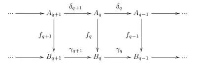 Un morfismo (de grado cero) entre dos complejos y es un conjunto de morfismos entre las estructuras algebraicas tales que . Simbólicamente indica lo mismo.