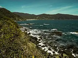 ![]() Vista a la playa Tril-Tril, donde aflora la asociación litológica milonitas-ultramilonitas del CMBM | ||