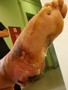 - Daño en el pie. La diabetes mellitus puede conducir a un flujo sanguíneo vascular deficiente a las extremidades. La lesión del pie con flujo sanguíneo inadecuado puede progresar a úlceras e infectarse. Las personas con neuropatía diabética pueden no notar el daño[18] y pueden desarrollar gangrena[19] (necrosis tisular debido a un suministro sanguíneo inadecuado).