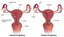 El embarazo es el desarrollo de un embrión o feto dentro del útero de una mujer durante un período aproximado de 9 meses o 40 semanas desde el último período menstrual hasta el nacimiento.[31] Se divide en tres trimestres, cada uno con una duración de aproximadamente 3 meses. El primer trimestre es cuando el embrión en desarrollo se convierte en feto, los órganos comienzan a desarrollarse, las extremidades crecen y aparecen los rasgos faciales.[32] El segundo y tercer trimestre están marcados por una cantidad significativa de crecimiento y desarrollo funcional del cuerpo. Durante este tiempo, el cuerpo de la mujer sufre una serie de cambios y pueden surgir muchas complicaciones que involucren al feto, a la madre o ambos.[33]