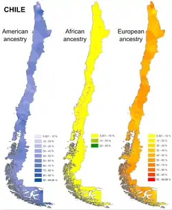 | 51,9 % | 44,3 % | 3,8 % | — | Fuentes et al. (2014): Gene geography of Chile: Regional distribution of American, European and African genetic contributions, fuente: PubMed.[5] Muestra replicada en Ruiz-Linares et al. (2014).[9] |