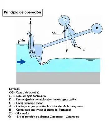 El principio de funcionamiento: La compuerta está fijada a un brazo oscilante, equilibrado por uno o más contrapesos. Solidariamente unido a la compuerta tipo sector se encuentra un fluctuador sumergido en el agua aguas arriba de la compuerta. Si el nivel aguas arriba se eleva el fluctuador elevará la compuerta incrementando la abertura por la cual fluye el agua, y por lo tanto dejando salir mayor cantidad de agua, el nivel aguas arriba tenderá a disminuir. Si el nivel agua arriba de la compuerta se reduce, la compuerta siguiendo el fluctuador se baja y disminuye el caudal de salida.