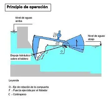 El principio de funcionamiento: La compuerta está fijada a un brazo oscilante, equilibrado por uno o más contrapesos. Solidariamente unido a la compuerta tipo sector se encuentra un fluctuador sumergido en el agua aguas abajo de la compuerta. Si el nivel aguas abajo de la compuerta disminuye, el flotador baja y consecuentemente la compuerta se levanta dejando pasar mayor cantidad de agua, es decir que el nivel tenderá a subir, cerrando la compuerta.