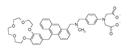 En una variación del sistema B, se utilizan tres señales químicas simultáneamente en una compuerta lógica AND.[2] Se obtiene una señal aumentada de fluorescencia del compuesto abajo representado sólo en presencia simultánea de protones, iones de cinc y de sodio, por su interacción con los grupos amina, carboxilo y éter corona, con lo cual este tipo de sistema se podría llegar a utilizar como detector de enfermedades, dado que estos tres cationes son importantes fisiológicamente.
