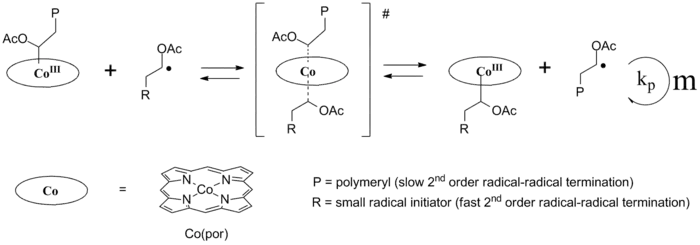 El débil enlace cobalto (III) - carbono es usado en la llamada polimerización radicalaria mediada por cobalto (CMRP), que es un tipo de polimerización radicalaria controlada.[4] Un enlace Co-C que contiene un iniciador de radicales se rompe (por el calor o la luz) en laun radical libre carbono y especies radicales de cobalto (II). El radical carbono inicia la formación de la cadena polimérica uniéndose al monómero, por ejemplo un alqueno, como en cualquier polimerización radicalaria común. El cobalto es inusual, ya que puede reformar reversiblemente un enlace covalente con el término del carbono radical de la cadena en crecimiento. Esto reduce la concentración de radicales al mínimo y también las reacciones de terminación no deseadas por recombinación de dos radicales carbono. El reactivo que captura el cobalto es llamado radical persistente y la cadena de polímero cubierta de cobalto se dice que está latente. Estas polimerizaciones pueden considerarse como una serie de reacciones de carbometalación de monómeros vinilo. Cuando el monómero carece de protones que puedan ser fácilmente ganados por el radical cobalto, se transfiere la cadena (catalítica).