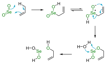 En términos del mecanismo de reacción, el SeO2 y el sustrato alílico reaccionan a través de procesos pericíclicos a partir de una reacción eno que activa el enlace C-H. El segundo paso es una [2,3] reacción sigmatrópica. Las oxidaciones en las que participa el dióxido de selenio a menudo se llevan a cabo con cantidades catalíticas del compuesto de selenio y en presencia de un catalizador sacrificial o co-oxidante tal como peróxido de hidrógeno.