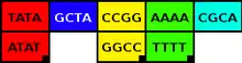 Consideremos por ejemplo un modelo de computación con ADN conocido como sticker model. Este modelo usa dos tipos básicos de hebras simples de ADN, llamadas hebras memoria y hebras sticker. Una hebra memoria tiene n bases de largo y contiene k sub-hebras no superpuestas, cada una de largo m. Así que, . Aunque no es necesario, se supondrá para la explicación, que cada sub-hebra sigue otra consecutiva (sin ninguna otra base entre medio). Cada sub-hebra representa exactamente una variable booleana, un bit. Las subhebras deben ser suficientemente diferentes unas de otras. Cada sticker es de largo m y complementario a una y solo una sub-hebra.