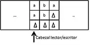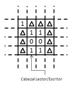 2. Un cabezal que puede leer y escribir símbolos en la cinta y mover la cinta a la izquierda y a la derecha una (y solo una) celda a la vez. En algunos modelos el cabezal se mueve y la cinta es estacionaria.