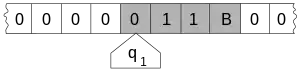 Aquí se muestra el estado interno (q1) dentro del cabezal, y la ilustración describe la cinta como siendo infinita y llenada previamente con '0', el símbolo sirviendo como blanco. El estado completo del sistema (su configuración) consiste del estado interno, el contenido de las casillas sombreadas incluyendo el blanco leído el cabezal ("11B") y la posición del cabezal.[9].