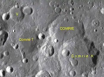 Es el elemento central de una formación de tres cráteres conectados. Un cráter ligeramente más pequeño se une al extremo norte, compartiendo un borde recto. Este cráter se sitúa también a través de la parte norte de un cráter mayor muy desgastado localizado hacia el sur, y muy poco del borde de Comrie sobrevive a lo largo de su lado sur. El resto del borde está desgastado y erosionado.