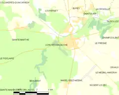 - Situación de Conches-en-Ouche en un mapa de Francia y de comunas limítrofes (en francés)