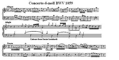 Reconstrucción hipotética elaborada por musicólogos. Siguiendo los nueve compases del BWV 1059 original, los eruditos se basaron en la cantata Geist und Seele wird verwirret, BWV 35 para esta reconstrucción.[25]