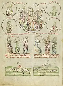 - fol. 256v-257r: Consejo de los pájaros: dos árboles con pájaros en las ramas con textos en alto alemán medio.