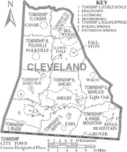 - Esta obra contiene una traducción derivada de «Cleveland County, North Carolina» de Wikipedia en inglés, publicada por sus editores bajo la Licencia de documentación libre de GNU y la Licencia Creative Commons Atribución-CompartirIgual 4.0 Internacional.
