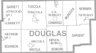 - Esta obra contiene una traducción derivada de «Douglas County, Illinois» de Wikipedia en inglés, publicada por sus editores bajo la Licencia de documentación libre de GNU y la Licencia Creative Commons Atribución-CompartirIgual 4.0 Internacional.