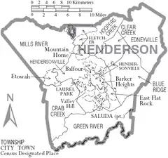 - Esta obra contiene una traducción derivada de « Henderson County, North Carolina» de Wikipedia en inglés, publicada por sus editores bajo la Licencia de documentación libre de GNU y la Licencia Creative Commons Atribución-CompartirIgual 4.0 Internacional.