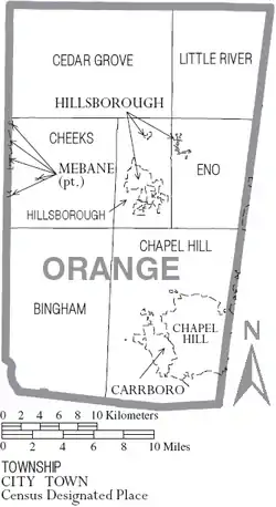 El condado se divide en siete municipios: Municipio de Bingham, Municipio de Cedar Grove, Municipio de Chapel Hill, Municipio de Cheeks, Municipio de Eno, Municipio de Hillsborough y Municipio de Little River.