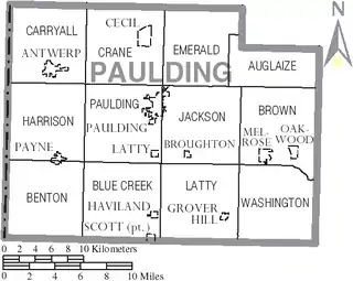 - Esta obra contiene una traducción derivada de «Paulding County, Ohio» de Wikipedia en inglés, publicada por sus editores bajo la Licencia de documentación libre de GNU y la Licencia Creative Commons Atribución-CompartirIgual 4.0 Internacional.