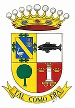 Cuartelado. Primer cuartel, corresponde al escudo de los Sánchez-Ocaña. Segundo cuartel, en campo de plata un pez de sable puesto en faja. Tercer cuartel, en campo de oro un árbol de sinople. Cuarto cuartel, en campo de gules un rollo de plata, acompañado a lo alto y a los flancos de tres coronas de oro, y en lo bajo de un cepo de oro puesto en faja. Lema, "Tal Como Era".