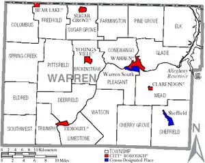 Brokenstraw | Cherry Grove | Columbus | Conewango | Deerfield | Eldred | Elk | Farmington | Freehold | Glade | Limestone | Mead | Pine Grove | Pittsfield | Pleasant | Sheffield | Southwest | Spring Creek | Sugar Grove | Triumph | Watson