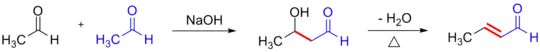La condensación aldólica consta en realidad de dos reacciones que ocurren in situ: primero se forma un β-hidroxialdehído (aldol) o una β-hidroxicetona conforme a la reacción aldólica. Corrientemente, se obtiene un sistema conjugado de un carbonilo α,β-insaturado como producto final, a través de la deshidratación del intermedio, pero también es posible reiterar la condensación y dar lugar a polímeros.[1]