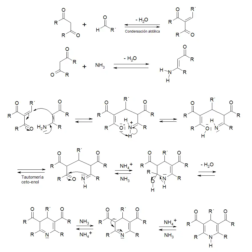En una síntesis similar, la síntesis de piridina de Hantzsch el mecanismo también se compone de una etapas inicial de una condensación de Knoevenagel de un compuesto β-dicarbonílico con un aldehído para formar una 1,4-dihidropiridina.[28]