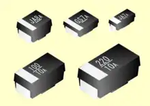 Los condensadores electrolíticos de tantalio y niobio con electrolito sólido como condensadores de chip montables en superficie se utilizan principalmente en dispositivos electrónicos en los que se dispone de poco espacio o se requiere un perfil bajo. Funcionan de forma fiable en un amplio rango de temperaturas sin grandes desviaciones de los parámetros.[4][6][8][9][10]