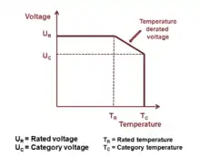 La resistencia a la tensión de los condensadores electrolíticos disminuye al aumentar la temperatura. Para algunas aplicaciones es importante utilizar un rango de temperatura superior. La disminución de la tensión aplicada a una temperatura más elevada mantiene los márgenes de seguridad. Por ello, para algunos tipos de condensadores, la norma IEC especifica una "tensión de temperatura reducida" para una temperatura más elevada, la "tensión de categoría UC". La tensión de categoría es la tensión continua máxima o la tensión de impulso máxima que puede aplicarse de forma continua a un condensador a cualquier temperatura dentro del intervalo de temperatura de categoría TC. La relación entre ambas tensiones y temperaturas se muestra en la imagen de la derecha.