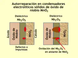 Un fallo poco frecuente en los condensadores electrolíticos sólidos es la rotura del dieléctrico causada por defectos o impurezas. En los condensadores electrolíticos de niobio, el dieléctrico es pentóxido de niobio (Nb2O5). Además de este pentóxido existe un subóxido de niobio adicional, el dióxido de niobio (NbO2). El NbO2 es un material semiconductor con una conductividad mayor que el Nb2O5 pero mucho menor que un cortocircuito. En caso de fallos o impurezas en el dieléctrico que evocan una ruptura dieléctrica parcial, el canal conductor se aislaría eficazmente mediante la reducción del Nb2O5 en NbO2 de alto ohmiaje si la energía es limitada.