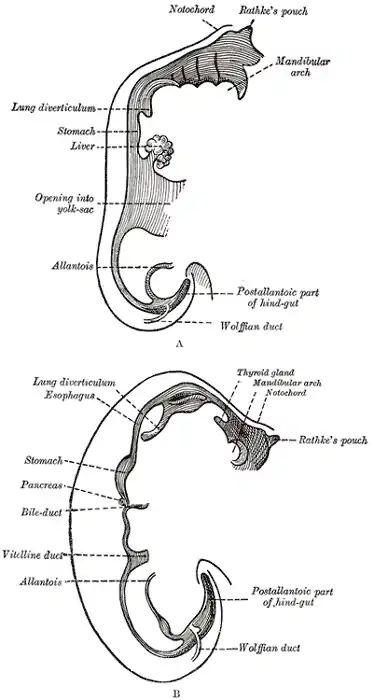 Vista frontal de dos estadios en el desarrollo del tubo digestivo.