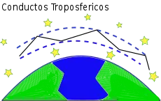 Un conducto troposférico es un espacio en el cual una onda electromagnética con rangos de frecuencia que oscilan en las bandas de VHF(Very High Frequency) y UHF(Ultra High Frequency) queda confinada entre dos masas de aire, creando un efecto similar a las guías de onda. Estas masas de aire están superpuestas, esto debido a un cambio en la temperatura que ocurre en la noche por la ausencia de calor y de corrientes de convección, a esto se le conoce como inversión de temperatura, haciendo que el aire caliente pierda densidad y ascienda sobre el aire más frío cercano a la superficie terrestre, creando un conducto que da lugar a un fenómeno de súper refracción, este conducto se conoce como conducto de superficie, debido a que está próximo a la superficie de la tierra. En las primeras horas de la mañana, cuando la temperatura de la tierra aumenta empiezan a aparecer las corrientes de convección haciendo que el conducto generado anteriormente se convierta en un conducto elevado, esto, debido a que las dos masas de aire se vuelven una atmósfera homogénea por el efecto de las corrientes de convección.[1][2]
