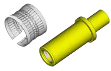 En un conector con contactos hiperboloides, cada contacto hembra tiene varios hilos longitudinales equidistantes retorcidos en forma hiperbólica. Estos hilos son muy resistentes a la tensión, pero siguen siendo algo elásticos, por lo que funcionan esencialmente como muelles lineales.[24][25] Al insertar la clavija macho, los alambres axiales de la mitad del zócalo se desvían, enrollándose alrededor de la clavija para proporcionar una serie de puntos de contacto. Los hilos internos que forman la estructura hiperboloide suelen anclarse en cada extremo doblando la punta en una ranura o muesca de la carcasa.[26].