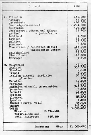 Durante los preparativos para la conferencia, Eichmann recopiló las cifras de los judíos que había en cada uno de los diferentes países europeos. Dividió estos países en dos grupos, «A» y «B». Los países pertenecientes al grupo «A» eran aquellos que se encontraban ocupados o bajo control del Reich —o parcialmente ocupados e inactivos—, como por ejemplo la Francia de Vichy; mientras que los que estaban listados en el grupo «B» eran aliados, estados clientes o títeres, neutrales, o los que estaban en guerra con Alemania.[64] Estas cifras también reflejaban las acciones que los nazis estaban llevando a cabo; por ejemplo, Estonia fue listada como judenfrei ―«libre de judíos»—, ya que los 4 500 judíos que quedaban en el país báltico tras la ocupación alemana ya habían sido asesinados para finales de 1941.[65] La Polonia ocupada no estaba en la lista porque el país se dividió en tres partes en 1939: las áreas polacas anexionadas por la Alemania nazi en el oeste, los territorios de Polonia anexados por la Unión Soviética en el este y el Gobierno General, donde muchos polacos expulsados y judíos ya habían sido reasentados.[66]