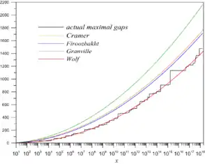 con probabilidad 1.[1] Sin embargo, como señaló Andrew Granville,[12] el teorema de Maier demuestra que el modelo aleatorio de Cramér no describe adecuadamente la distribución de primos en intervalos cortos. Por ello, un refinamiento del modelo de Cramér teniendo en cuenta la divisibilidad por pequeños primos sugiere que (A125313), donde es la constante de Euler-Mascheroni. János Pintz ha sugerido que el límite superior puede ser infinito,[13] y de manera similar Leonard Adleman y Kevin McCurley escribieron que: