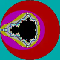 y si el exponente es negativo, la secuencia es estable. Los píxeles blancos en la imagen son los parámetros c para los cuales el exponente es positivo, también conocido como inestable. Los colores muestran los períodos de los ciclos que atraen las órbitas. Todos los puntos de color azul oscuro (exterior) son atraídos por un punto fijo, todos los puntos del medio (azul más claro) son atraídos por un ciclo de período 2 y así sucesivamente.