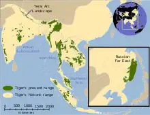 En Camboya, se avistaron tigres en áreas forestales remotas a mediados de la década de 1980. Las áreas protegidas se establecieron en 1993, pero grandes extensiones de bosque fuera de estas áreas se entregaron como concesiones madereras a empresas extranjeras.[28] En 1998, los cazadores entrevistados corroboraron la presencia de tigres en las montañas Cardamom y Dâmrei.[34] Durante los censos realizados entre 1999 y 2007 en nueve áreas protegidas y más de 300 lugares en todo el país, se registraron tigres solo en el Bosque de Protección Mondulkiri y en el parque nacional Virachey. Por lo tanto, la población de tigres del país se consideraba extremadamente pequeña.[35] A partir de 2015, se considera posiblemente extinta.[30] En Tailandia, los bosques se protegieron mediante el establecimiento de 81 parques nacionales, 39 santuarios de vida silvestre y 49 áreas de no caza entre 1962 y 1996, incluidas 12 áreas protegidas que superan los 1000 km² (390 millas cuadradas). La tala fue prohibida en 1989.[28] A pesar de esta extensa red de áreas protegidas, se registraron tigres en 10 de los 17 complejos de áreas protegidas durante los estudios realizados en todo el país entre 2004 y 2007. La densidad de tigres fue menor que la prevista sobre la base del hábitat forestal disponible. La población de tigres de Birmania se limitó a la región de Tanintharyi y al Santuario de Vida Silvestre del Valle de Hukawng en 2006.[36] En Malasia peninsular, los tigres se encuentran solo en cuatro áreas protegidas que superan los 400 km² (150 millas cuadradas).[37] El último tigre de Singapur recibió un disparo en 1932.[38]