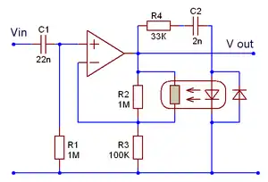 Dado que el diodo detector de AM produce un voltaje de corriente continua proporcional a la intensidad de la señal, este voltaje se puede retroalimentar a las etapas anteriores del receptor para reducir la ganancia. Se requiere una red de filtro para que los componentes de audio de la señal no influyan de manera apreciable en la ganancia; esto evita el "aumento de modulación" que aumenta la profundidad de modulación efectiva de la señal, distorsionando el sonido. Los receptores de comunicaciones pueden tener sistemas de control automático del volumen más complejos, que incluyen etapas de amplificación adicionales, diodos detectores de ganancia separados, diferentes constantes de tiempo para las bandas de transmisión y de onda corta, y aplicación de diferentes niveles de voltaje a diferentes etapas del receptor para evitar la distorsión y la modulación cruzada.[4] El diseño del sistema de control automático del volumen tiene un gran efecto en la usabilidad del receptor, las características de sintonización, la fidelidad del audio y el comportamiento en caso de sobrecarga y señales fuertes.[5]