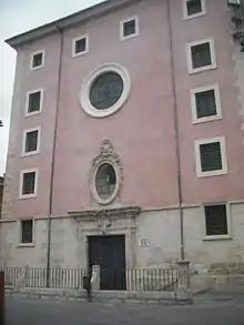A finales del siglo XIX se acometen restauraciones en el edificio; en la fachada principal se somete a un tratamiento semejante al de un edificio civil, con ordenación vertical a base de ventanas, en la que únicamente destaca por su disposición, que no por su tratamiento, la portada. La puerta es adintelada, y está enmarcada por unas pilastras que sostienen un amplio entablamento, sobre el que se dispone un óculo ovalado; éste se adorna con una guirnalda en la que figura la insignia del papa -la mitra y las llaves-, emblema de la Orden de San Lorenzo Justiniano.